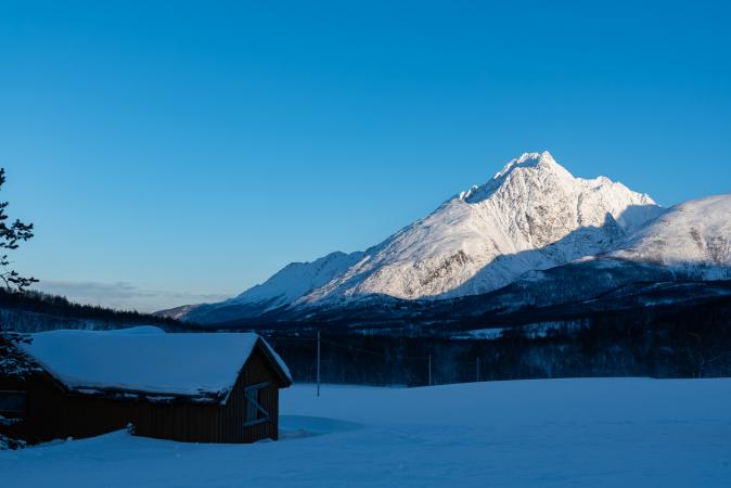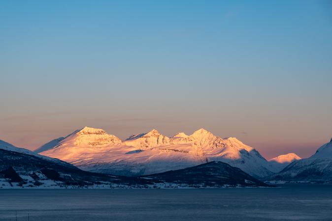 We turn around a little before Lakselvbukt to go to the other side of the fjord via Laksvatn. Last light on the mountain.
