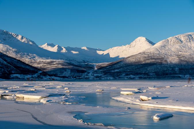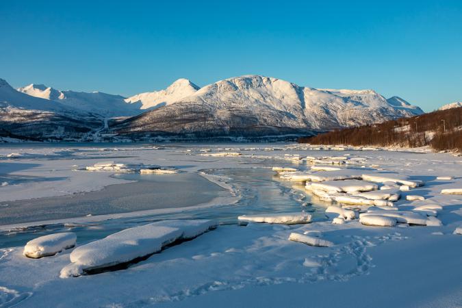 Superb photo spot at Olderbukt with frozen fjord floor and large chunks of ice.