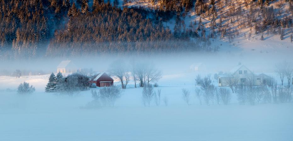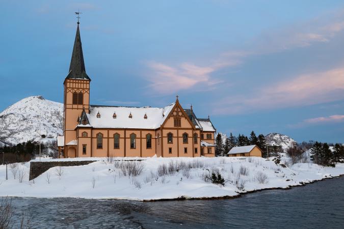 It's -20°C. We take the road back to Jovik and pass a small church.
