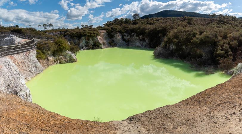 It's much nicer than Te Puia. We leave at 1.30pm. We then go to Wai O Tapu Thermal Wonderland, another geothermal zone. Admission is 65 $NZ for the two of us. We're told to bring water, as it's hot. It's a self-guided tour. There are 3 one-way circuits, so you don't run into other people. We start at 2.30pm. There are steaming holes, bubbling mud pools, colored pools including Champagne Pool, which is orange, another sky-blue, and the last one neon green.