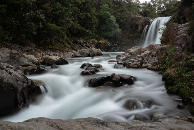 But it's not sunny enough. We set out again around midday. Picnic stop on the shores of Lake Taupo with a view of the Tongariro range under a very heavy sky. We set off again at 2pm, heading for Whakapapa Village in the Tongariro National Park. It's still very overcast, but it's stopped raining. We arrive at 3.15pm. We go to the Visitor Center to ask about the Tongariro Alpine Crossing hike for tomorrow. The lady tells us a big no, the weather is rotten: strong wind, rain, freezing temperatures and no improvement until Friday. What's more, the conditions for getting there have recently become very difficult: advance registration on the Internet (free), compulsory shuttle bus as the hike is one way, paying 60 $NZ per person. We drop off our car at the trailhead and a shuttle bus takes us to the start of the hike. It's no longer possible to park at the start, go up to the Emerald Lakes and back again, as parking time is limited to 4 hours. So that's it for the wow effect on the emerald lakes at the top of Tongariro. At around 4pm, before the bad weather arrives, we head off to see Tawhai Falls, also known as Gollum Falls, where a scene for The Lord of the Rings was filmed. A very pretty waterfall, we spend almost an hour there taking long exposure photos.
