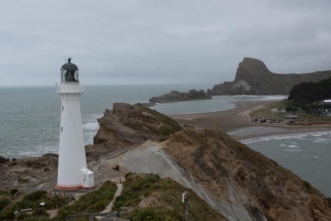 Monday, October 30: up at 7.45am. Breakfast outside, which is rare, sunny despite heavy clouds and a bit of wind. Departure at 9.40am. Shopping. Back on the road to Castlepoint. At midday, we cross Palmerston North. We stop for Baconator at Wendy's. Around 2.00pm, we take a break at the Kaka Cafe. We arrive at 4pm at the Deliverance Cove parking lot and Freedom campsite. It's foggy and raining. But it stops in 5 minutes, so we head off to see the lighthouse. We cross the beach and climb up to the Castlepoint lighthouse.