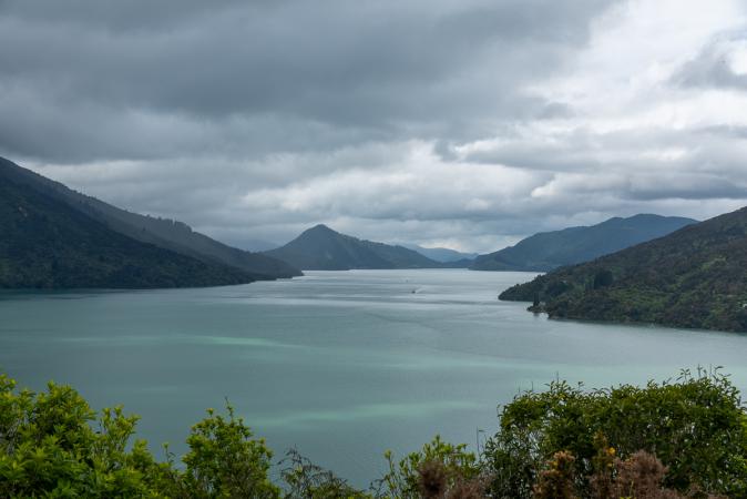 We arrive at 11.40am. The weather is nice despite the heavy clouds. We are going to tour the South Island in a counterclockwise direction. We therefore take the road from Nelson to the West via the Queen Charlotte Drive which passes through the mountains and offers views of the fjords of Malborough Sounds. But there are not many stops possible to park the van on the side of the road for a photo.
