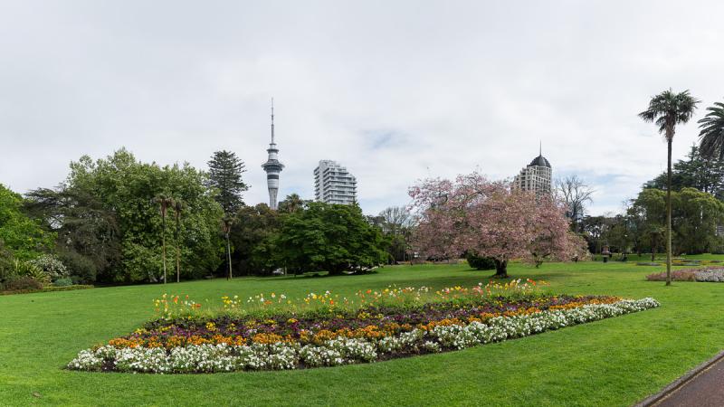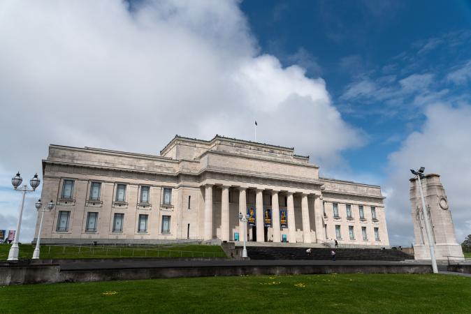 The weather's starting to warm up, but it's damp. We then head for the Auckland War Memorial Museum. The building is set in a large green park.