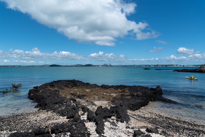 From up here, you can see Auckland. Then we take the Summit Road trail to McKenzie Bay. It's not very interesting, we find it long. At the bay, there's a small red-and-white lighthouse. Then we take the McKenzie Bay Road back to the boat dock. This path runs along the coast and offers nice views of Auckland Bay, with contrasting black rock, blue sky and turquoise sea.