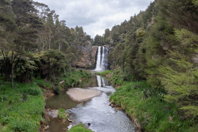 We go shopping at the nearby Park'n Save. Make sure you drive on the left! We stow the groceries, making the most of the space available in the compartment above the driver/passenger seats and in the fridge. Time for adventure! We leave Auckland at 11am. We decided not to visit the Cape Reinga peninsula in the far north, as this would have required 2 or 3 days of driving time. We also eliminated the Coromandel Peninsula from the program, and Cathedral Cove in particular, as it was visibly damaged by the last storm. So we're heading south towards Hunua Falls. Get used to driving on the left! We arrive at the parking lot around noon. First we have to clean our shoes on a roller and in a kind of foot bath. The waterfall is 50 m away, first visible from the bridge over the river and then at its foot.