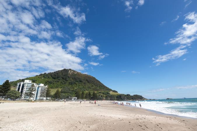 Sunday, October 22: up at 6.15am. It's overcast. We leave immediately at 6.45, after a short trip to the bathroom. Breakfast on the road. Direction Tauranga on the east coast. We drive over a pass in mist, then on the other side it's sunny with a few clouds. On the road, we enter a toll road. Don't forget to pay online. We arrive in Tauranga at 7.45am. Breakfast on the beach after having been lucky enough to find a parking space. There are lots of people. We leave the van at 8.30am to climb Mount Maunganui, an extinct volcano.
