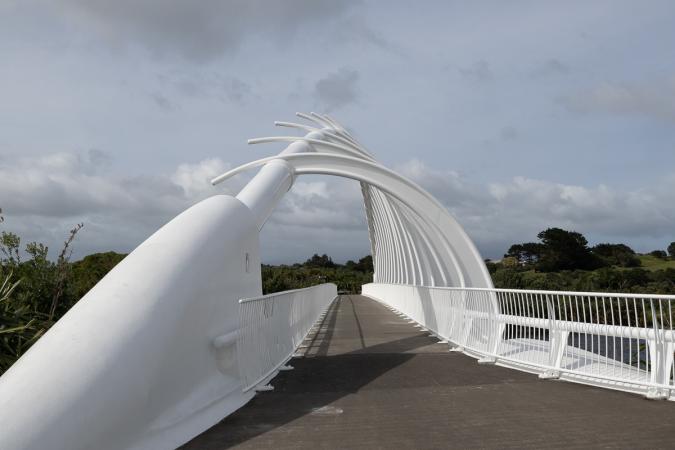 Friday, October 27: up at 7.45am. It was very windy last night and raining intermittently. We leave the campsite at 9.30am. The weather's improving, but it's still windy. We're off to see the famous fishbone-shaped Te Rewa Rewa Bridge.