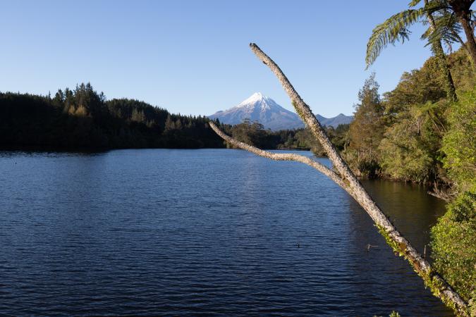 Saturday, October 28: up at 6am. A bit cold last night. This morning, the sky is blue and Mount Taranaki shows off its snow-capped peak. Departure at 7.10am. We head off to Lake Mangamahoe to take photos of Taranaki's reflection. Well, no reflection, it's a bit windy.