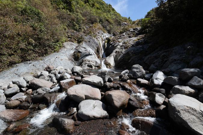 Then the trail continues along the river. River we have to cross on rocks at one point from where the view on Mount Taranaki is great.