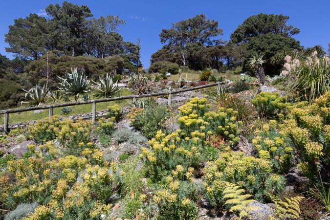 It's a small volcanic island. We arrive at 10am. We combine three trails, starting with the Summit Track, which climbs to the top of the volcano. It climbs 259 m over 2.4 km. There are a few volcanic lava flows. The crater is overgrown and barely visible.