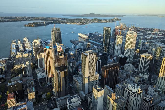 Then we pick up tickets to climb the Sky Tower (76 $NZ for two). Beforehand, we dine at the tower's restaurant. We then go up to level 60 at 7pm, Sky Desk 220 m high. The view is pretty good in the late evening light. Rangitoto Island can be seen in the background at the top of the photo: