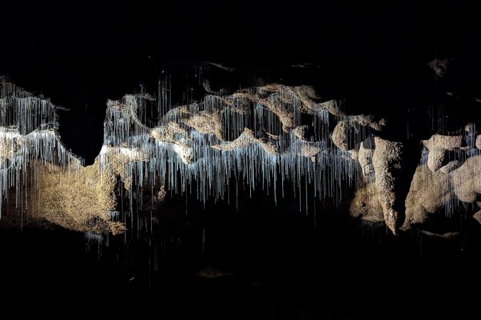 It's a pretty one. The path leads to another viewpoint higher up in 5 minutes. The view is less pleasant. We're back on the road by 1pm. We stop at Otorohanga to book a camping pitch around 4pm. The check-in is done alone with online booking but it doesn't work. Another couple is there too and they call the manager, who tells us we can go and set up. We take down the table and chairs to keep the pitch. In the campsite, there's a fully-equipped kitchen and a communal dining room in the style of a youth hostel. Then at 4.20pm, we set off for Waitomo Caves, 15km away. Tickets are 150$NZ for both of us. Next visit at 5pm. We start on foot, the guide showing us some beautiful formations. Then we arrive in a large hall, the "cathedral". The guide sings a song to help us hear the resonance. We then go to the back of the cellar and see some glow-worms with dangling threads.
