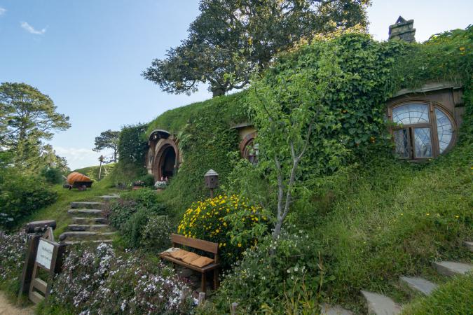 Rhaaa Waze drove us to an unpaved road, so we drove an hour for nothing. What a waste of time! It's already 11.30am. Half turn. As a result, we don't have time to go to the waterfall. We head straight for the Opal Hot Springs & Holiday Park campsite. We settle in and nibble. The sky is getting heavy, and we're afraid of a storm. Then it's off to Hobbiton Movie Set for the 4.40pm visit. On the way, we take a few photos of the hills with the sheep. Finally, it's sunny again. We arrive at Hobbiton Movie Set at 3.50pm - we're wide open! We're the last group on the tour, just 13 people, which is cool. Even if you're not a fan, it's a very pleasant ride. The backdrops in the green hills are really well done, and make you want to live there!