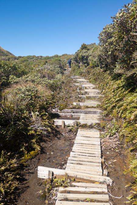 But there's a nice view of the mountain. We hit the road again to get to the start of the Mangorei trailhead. We start the hike to Pouakai Tarns at around 8.30am, in 5°C. The trail is entirely on wooden footbridges, with 3,000 steps of varying lengths.