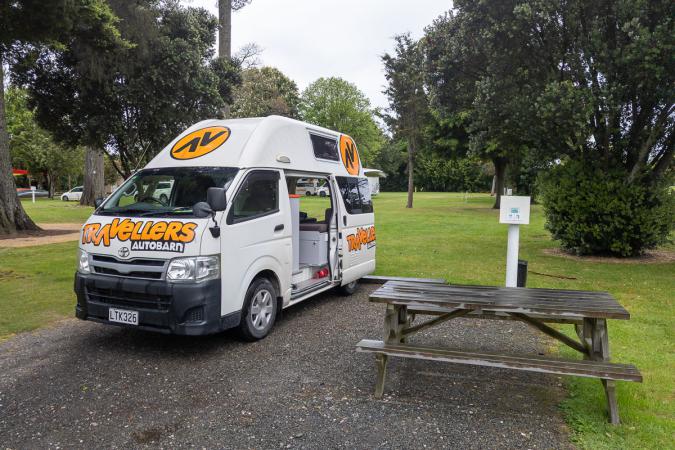 Finally, we reach our campsite, Whakapapa Holiday Park, at 5.30pm. The pitches are well separated from each other by trees.