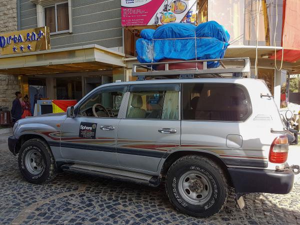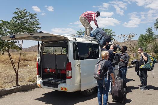 Une fois les bagages récupérés, on est accueilli par Mekashaw dit Mika qui sera notre guide pendant notre séjour. Il fait parti de Sphère Tour & Travel. Il nous présente le chauffeur Sovalo. Celui-ci charge les bagages sur le toit d'un minibus.
