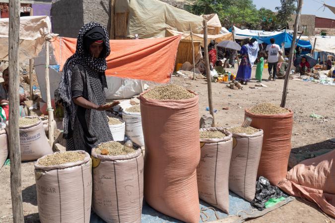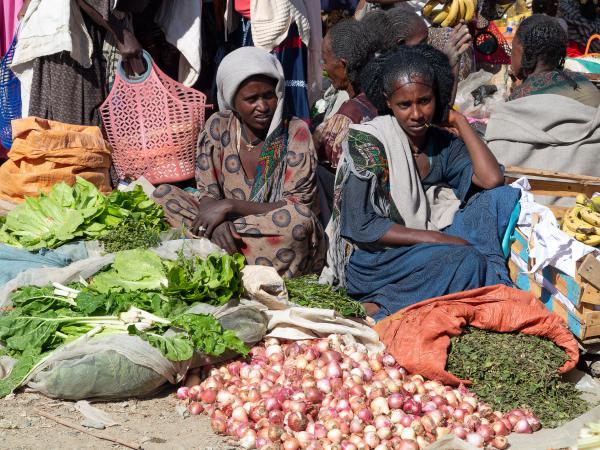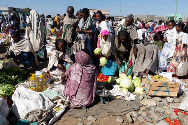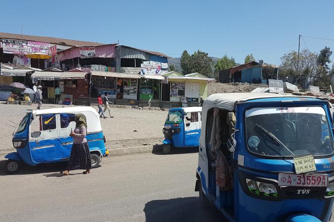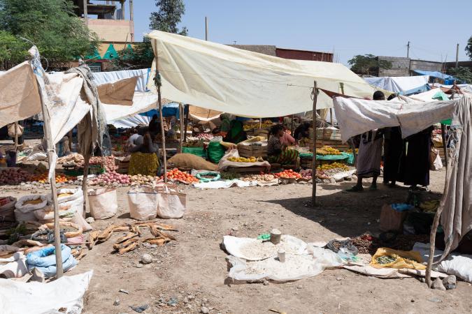 Une autre voiture est déjà partie avec un cuisinier. On a environ 300 kilomètres à faire pour aller jusqu'au campement de l'Erta Ale. On s'arrête dans un village de la région de Mékélé où il y a un marché, Blazat. On fait le tour du marché avec Mika, c'est très coloré. Les étals sont à même le sol : légumes, épices, sandales en plastiques, tissus...