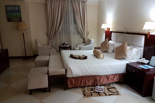 Il y a un bouchon de tuk-tuk et de camions, ça grouille de monde. On s'arrête déjeuner dans un restaurant à 12h50 (poulet curry). La route est super longue, heureusement on a récupéré de l'asphalte. On est contrôlé plusieurs fois et une fois on nous demande les passeports. Après 10h00 de route, on arrive enfin à notre hôtel à Mékélé, dans la région du Tigré : Desta Hotel à 18h30. Les bagages doivent passer dans un portique de sécurité. On s'installe dans nos chambres, c'est très classe,