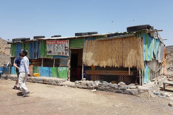 À 10h35, on arrive dans la ville de Abala à 1470 m d'altitude, c'est le début de la région Afar. Johnny et Mika vont chercher les autorisations pour monter sur le volcan Erta Ale. Pendant ce temps, on boit coca ou café dans un boui-boui. On emmène avec nous un policier Khaleb (et sa kalashnikov) qui nous accompagnera jusqu'à la fin de notre séjour. On s'arrête manger dans un autre village : Irepahti, à midi. Le « resto » est une cahute faite de bois et de tôle.