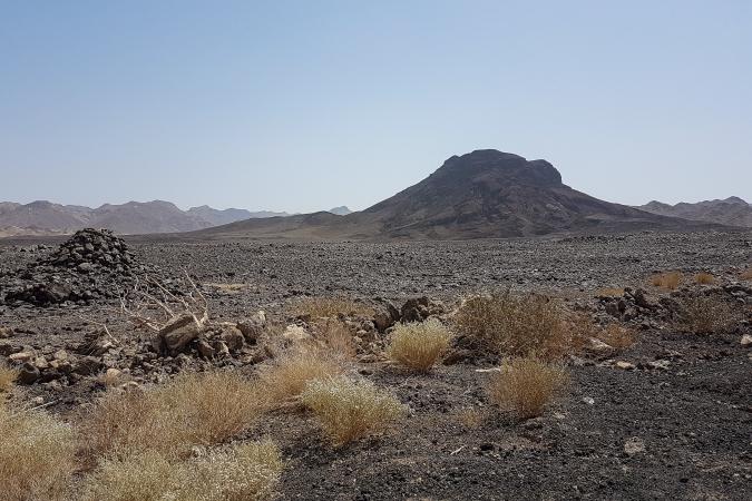 À partir de là, il faut monter à pied. Avant cela, on finit de préparer nos affaires et donner au guide les sacs qui vont monter avec les chameaux. On commence la montée à pied à 17h10, il fait 36 degrés. Ça monte en continu mais tranquillement, pas de gros dénivelé, mais cela se fait dans la caillasse volcanique, pas des plus agréable ! On fait pas mal de pauses pour boire car il fait très chaud. On va là-haut :
