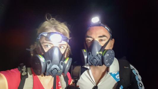 On dîne des spaghettis préparés par notre cuisinier assis sur des matelas. On va ensuite voir le lac de lave. En cours de chemin, on doit mettre les masques à gaz. Les fumées viennent vers nous.