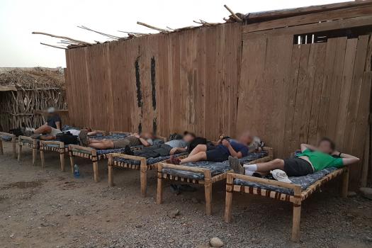 On descend à 150 m d'altitude. On passe devant des villages nomades : cahutes en bois. On se demande comment ils font pour vivre ici. Il n'y a rien, pas d'eau, rien à manger. On voit les tombeaux de leurs morts. Mika nous explique que les morts sont enterrés là où ils meurent. On passe une barrière et on prend une piste à gauche, tout droit c'est l'Érythrée. Il fait très chaud, environ 40-42 degrés à 14h20. Une route en béton faite par les chinois est en construction le long de la piste, ce sera bientôt le défilé des touristes. À 15h00, on quitte la piste pour s'enfoncer dans le bush, dans le sable, pour aller payer une autorisation aux Afars. On s'arrête encore dans un autre village pour un autre contrôle et encore payer ! À 16h35, on arrive enfin au camp. Il s'agit de cahutes en pierre et toit de paille au pied du volcan Erta Ale.