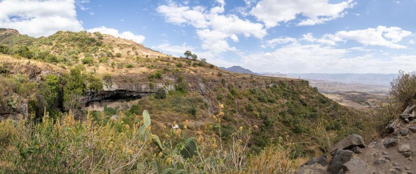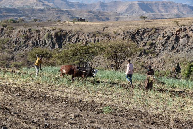 Il y a des cultures en terrasse. Lors de la traversée de villages, les gens et surtout les enfants réclament de l'argent. On monte jusqu'à 3130 m d'altitude, c'est beaucoup plus vert : il y a des eucalyptus, des bambous, des bananiers et des champs de maïs, orge, blé, haricots, oignons et choux. Le guide achète des pois chiches chauds et des graines pour nous faire goûter. On redescend de la montagne et c'est très arboré. Le paysage est chouette, dommage qu'il y ait des ordures un peu partout. L'agriculture se fait à l'ancienne avec des boeufs.