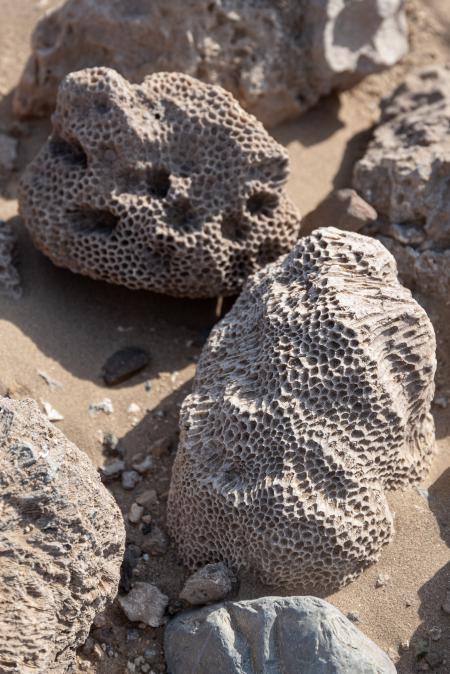 C'est très hostile : sec, très chaud : 45 degrés. À 16h45, on fait un nouvel arrêt à un endroit où on est à 0 au niveau de la mer. Mika nous emmène voir plein de rochers fossiles : coquillages, éponges de mer...