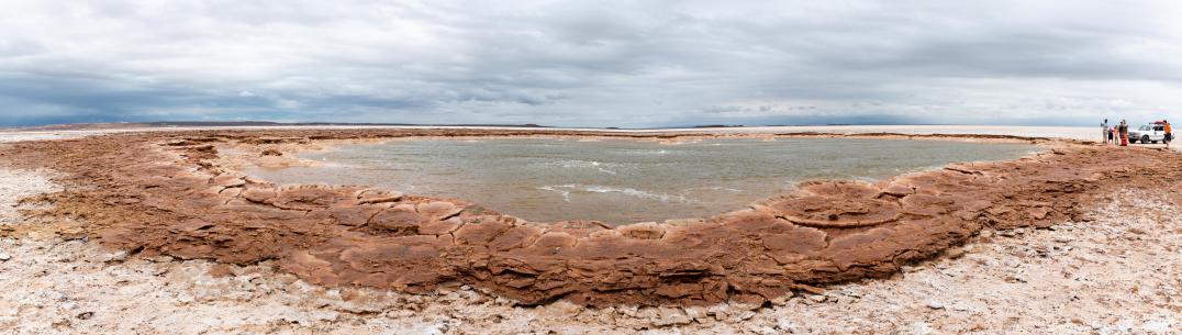 C'est vraiment magnifique. C'est plus grand que ce qu'on pensait. Par contre, on se reprend une bonne averse. L'eau n'est pas froide mais on est trempé jusqu'aux os. Il fait 25 degrés. On reste 2h20 sur le site. Malheureusement, pour cette visite, on marche sur ces formations, ça « croustille » sous nos pieds et on abîme tout. On n'aime pas ça. Faut vraiment que quelque chose soit fait, des pontons par exemple comme à Yellowstone, sinon en quelques années et avec la montée du tourisme, le site sera détruit. On revient aux voitures à 13h30 et on va voir un autre site. Là, il s'agit de "pics" en sel.