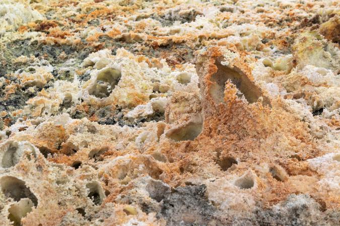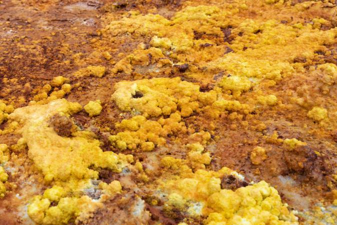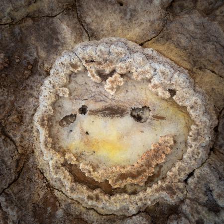 Vendredi 21 février : debout à 4h45 car la veille, on a négocié avec Mika pour retourner à Dallol. Le ciel est couvert. On part à 7h10. Le militaire nous fait faire un tour différent. Ici le jaune est éclatant.