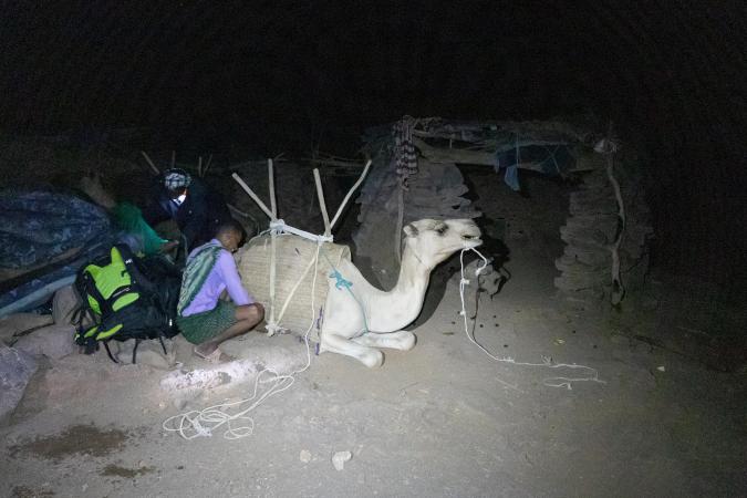 On arrive de nuit au 2ème campement à 19h15. On a fait 4,4 kms avec 285 m de dénivelé. Ce camp est fait des mêmes cahutes en pierres. Les chameaux arrivent à 19h30.