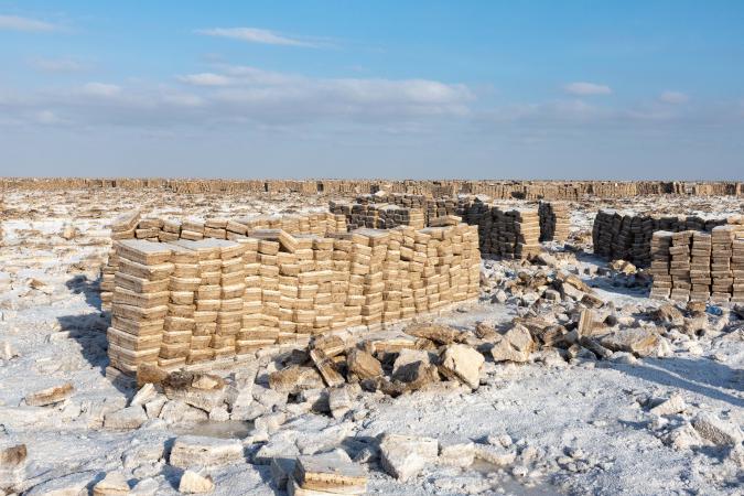 Elle parle 3 mots de français "bonjour ça va". A 16h30, on part pour le lac Karoum. On y voit les blocs de sel extraient par les travailleurs et empilés en attendant d'être emportés par camion (plus de caravanes de chameaux).