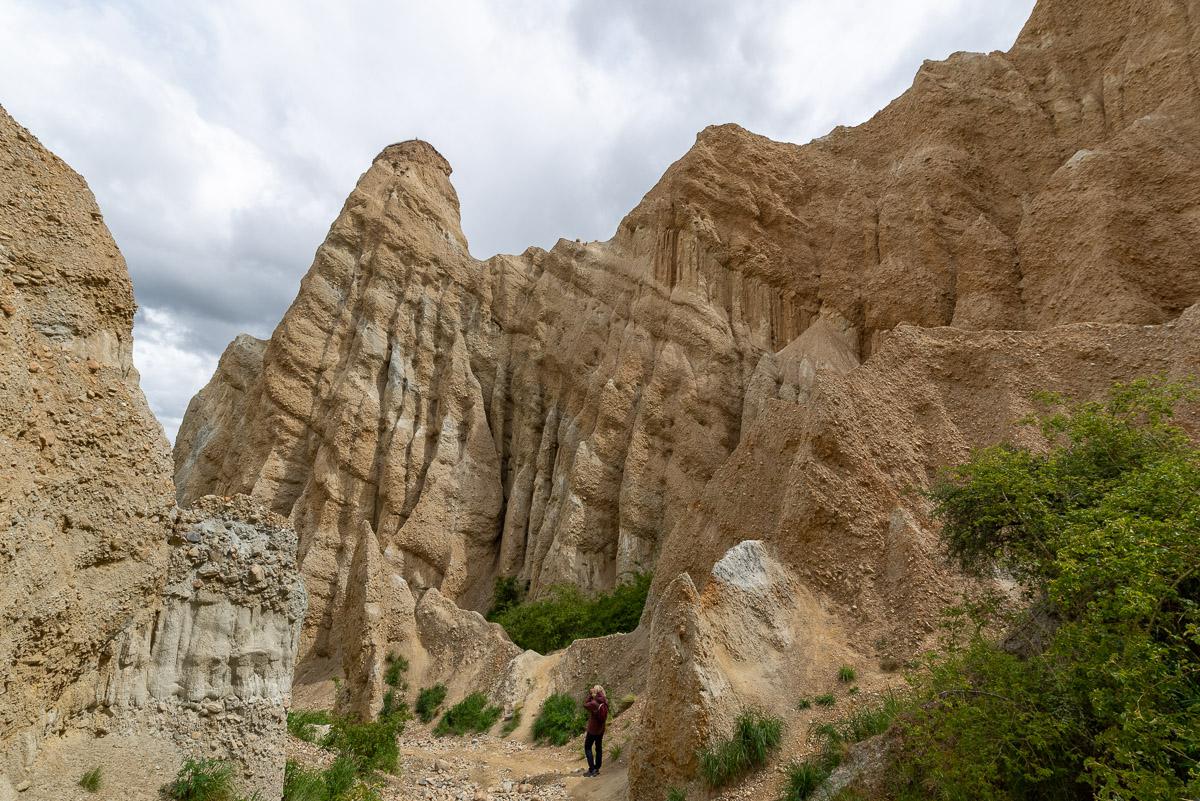 Ces falaises d'argile hautes d'environ 30 mètres sont visibles depuis la route et facilement accessibles en voiture puis à pied. Les Clay Cliffs se situent sur un domaine privé dont la route est payante : 5$NZ qu'il faudra laisser dans une "honesty box". Ensuite, un sentier conduit aux pied de ces falaises. On se sent tout petit.