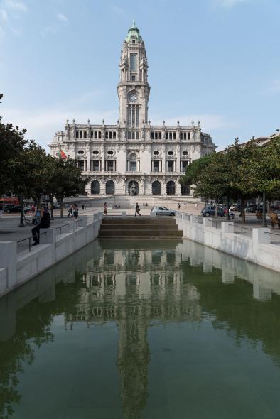 There are a lot of people. We go back to the Torre dos Clerigos and go up to the top. The view of the city is great. Then we take the Avenida dos Aliados. We pass the Town Hall and Trendade Church.