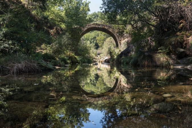 In one, we see corn. We then walk to a stone bridge, Ponte Ladeira (0,6 mile one way). There are pretty reflections.