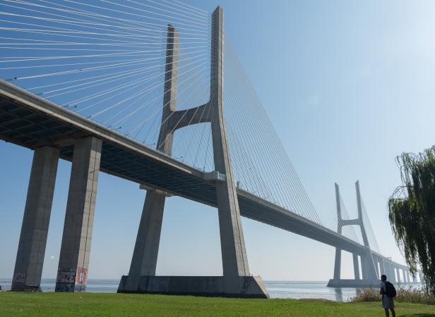 Monday september 10 : up at 7 am. We go to the Decathlon not far from the campsite to buy a table and camping chairs. It is super large and well equipped with camping gear. We will try to approach the great bridge Vasco de Gama. We see signs that lead to the pillars of the bridge. We park at Parque de Tejo, well placed to take pictures.