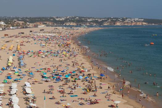 Then we return to the campsite at 12:45 pm. Shower for David who is soaked, I rinse quickly handmade his clothes. Lunch of tomatoes, crackers, peaches. At 3:30 pm, we will see Praia da Rocha. We stop at a craft ice cream shop. Too good. We continue to a point of view in height of the beach. What a horror: a crowd of people on their towels! And towers of buildings in the background.