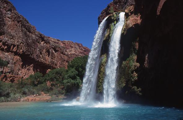 Tuesday June 13 : early wake up at 5:30 am. Departure from Kingman towards Grand Canyon (2:30 drive). At 10 am we start to descent in the canyon to join Supaï (Indian village) and then Havasu Falls (20 $). After a descent in the sun with 30°C and 10 miles in the sand and rocks, we finally reach Supaï around 3:30 pm. This indian village is quite cool : wooden houses, shop, restaurant. But indians are no longer what there were ! They are dressed with Nike clothes, listen to Metallica on Sony players. They also have parable of 1.5 meter in diameter ! We supply in cold drinks and continue to descent to the campground (10$). At the bottom it's heavenly ! The paradise after the hell of the descent! Havasu Falls is there, majestic. We take in our eyes. It's beautiful.