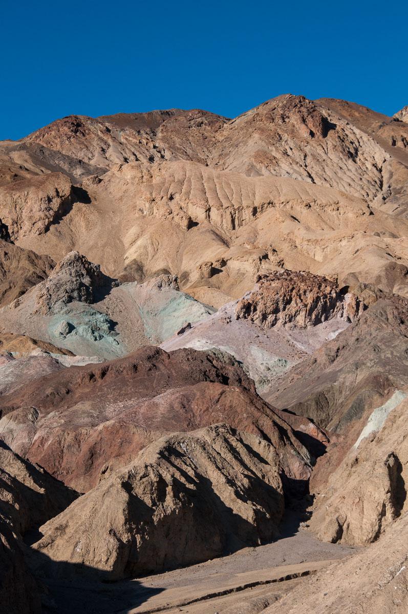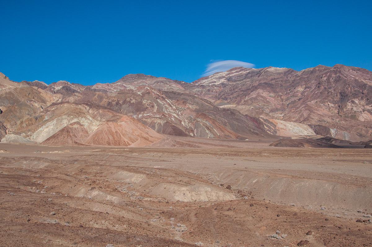 Thursday june 24 : taking the road to Death Valley. We arrive at Beatty and we take a room at Motel 6. We are waiting for the end of the afternoon to go to Death Valley. We take this opportunity to make a laundry and eat a little. We start around 3:50 p.m., it's 100° F (38 ° C). We enter Death Valley and the temperature rises more: 104 ° F, 112, 117, 118 = 48° C at 6 pm ! We start with Artist Drive. There are two interesting viewpoints. The first is a little high on a hill and gives a panoramic view. There is a wind to fly caps! It is hard to breathe because of stron wind when it was in front and it's hot. The second stop is Artist Palette that shows a whole shade of color.