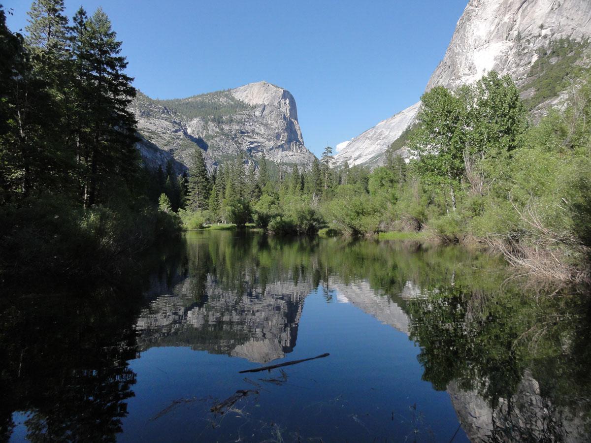 Sunday june 27 : we leave for Yosemite at 9 am. We arrive at the park entrance around 9:20 am and we realise that all the campground are full. We try anyway at the Curry Village. There still is place at Camp 4. But it's a walk-in campground : the car remain on the parking lot outside the campground. We book for 4 nights. We carry our baggage, cooler...and we plant the tents: the sites are pretty bad, not well marked or delimitated. In addition, because of the bears, we must store food and toiletries in iron boxes. Anything that smells must be enclosed, nothing in the car. It's a mess to carry everything and furthermore the cooler does not fit into the box. We are forced to drain the water and to lie it on the side for it enter the box. At 3pm, we return to the Curry Village to see if there is place in a campsite a little better. No, no! We then go to walk to Mirror Lake. It's beautiful but crowded.