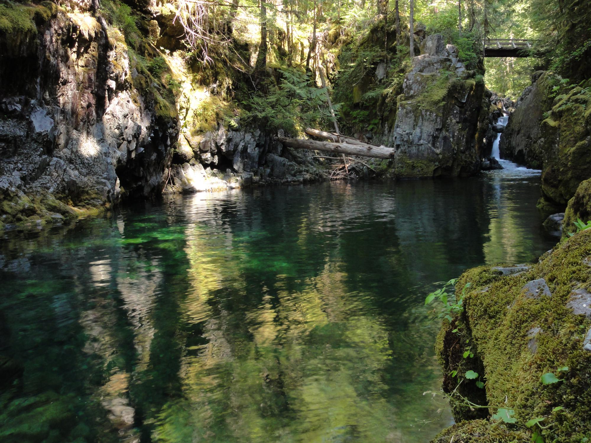 Thursday july 8 : drive to Opal Creek Scenic Recreation Area. The trail starts on a wide path then at a crossing we turn right and follows the sign « Opal Creek ». From there, there isstill 3 miles to walk (the whole trail is 8 miles roundtrip). The path is in the middle of the forest and we sometimes can hear the river. Opal Pool is a kind of poolsurrounded by rocks. The green trees are reflecting in the water so we can believe it's the water that is green.