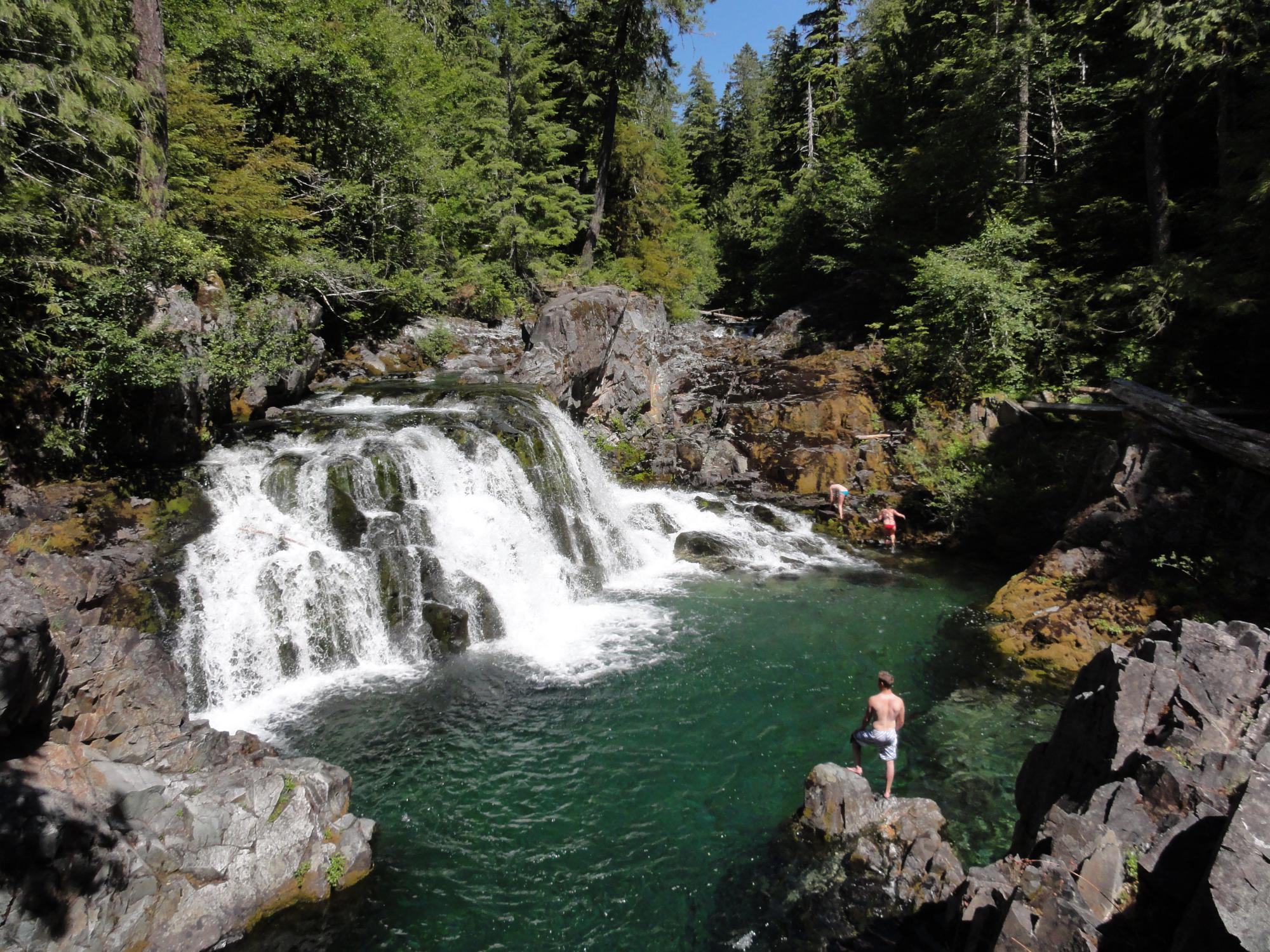 Saturday july 10 : we return to Opal Creek to see a cascade, Sawmill, that we miss on thursday and to see the Three Pools. We start with three pool but it's very crowdy. Not easy to picture. Then we go to Sawmill. To find it, we have to go behind a wooden barn that is beside the path. The waterfall is very beautiful