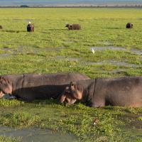 Amboseli National Park lies in southern Kenya on the border with Tanzania, which is why Kilimanjaro can be seen here on a clear day. Amboseli is one of the country's largest parks, covering almost 400 km². A national park since 1974, it was designated a UNESCO World Heritage Site in 1980. Lake Amboseli covers more than a quarter of the park, but is often empty during the dry season. After the rainy season, the lake and marshes are a haven for animals, especially hippos.