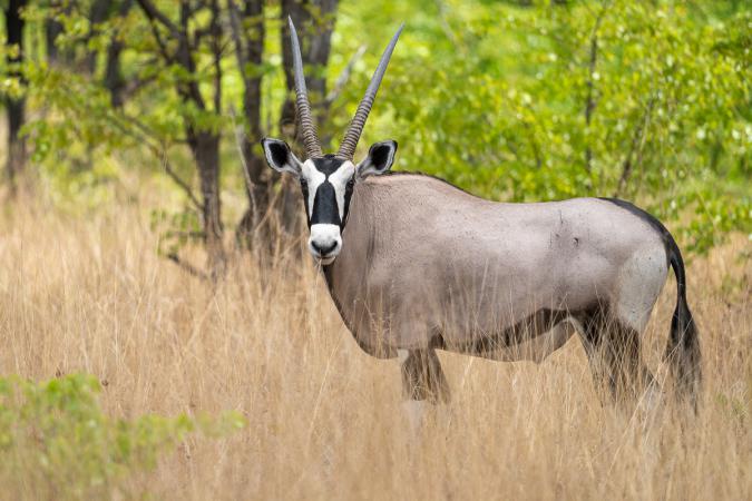 On est content d’en voir autant pendant ce voyage. Là, il y en a un douzaine. Mais beaucoup sont cachés dans les buissons. Le paysage change tout le temps, là une savane blonde un peu grillée, mais quelques arbustes verts. Un peu plus loin, on rencontre un oryx. J'adore !