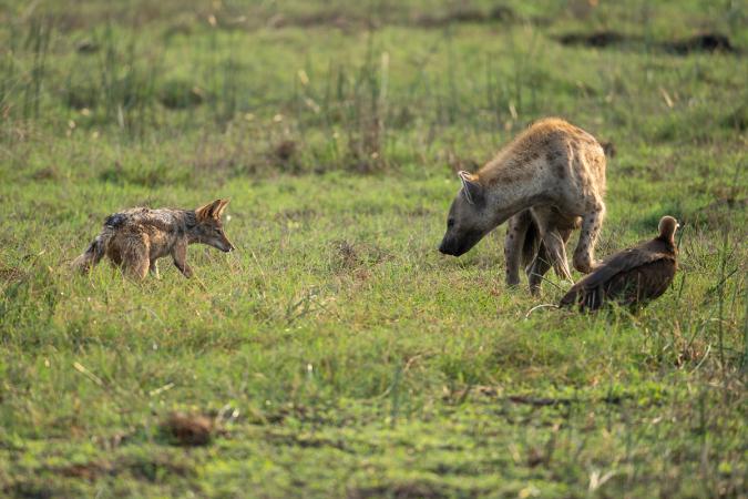 On est trop content, on ne s’attendait pas à en voir. On poursuit et on s’arrête regarder un aigle pêcheur perché sur une termitière. De temps en temps, Newman parle dans la radio de la voiture, ça doit s’échanger des infos ! Une hyène nous regarde passer. Puis on voit un chacal, bien assis dans les hautes herbes.