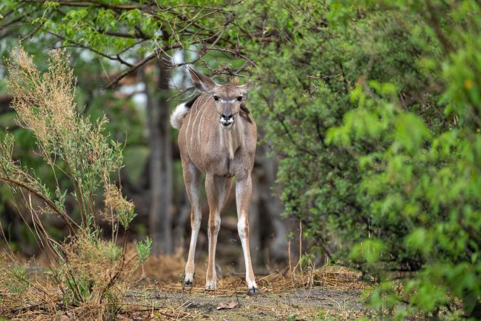 D’après notre guide, il a 4 jours. On passe du blond de la savane au vert de l’herbe où broutent des koudous. C’est joli aussi comme animal avec ses grandes oreilles et ses traits blancs sur le dos.