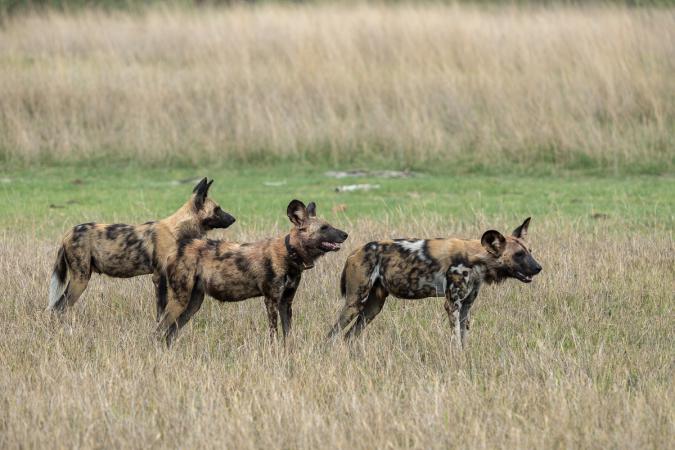 D’un seul coup, notre guide accélère et trace. Ça secoue ! Dans une plaine avec quelques herbes hautes, des lycaons guettent et se reposent. Oh, trop bien ! C’était l’un de nos objectifs : voir des lycaons !