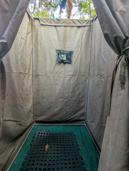 et légèrement à l’écart les tentes pour le personnel. Nos tentes «dodo» sont équipés de deux lits de camp avec des couettes chaudes, une petite table de nuit et d’une armoire avec moustiquaire. A l’arrière, une douche est installée
