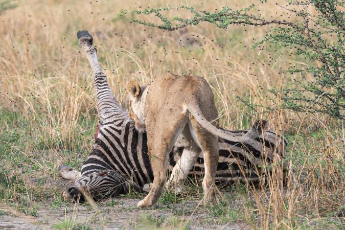 On aperçoit quelque chose au loin. A moins que notre guide ai eu l’info, on tombe sur de nouveaux lions. Deux femelles qui ont chacune 3 jeunes de 6 et 8 mois. Ils font partie de la South Pride. Ils sont en plein déjeuner d’un zèbre apparemment tué la veille.